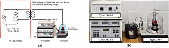 As shown in Figure 2, the samples were manufactured in a disc shape with a diameter of 120 mm and an average thickness of 1.05 mm, making them suitable for measuring dielectric BDS through the insulation material. To comprehensively characterize the properties of the epoxy/Al2O3 micro-composites, the relative permittivity and dissipation factor, which are related to insulation performance, were measured prior to the AC-BDS test. The Fully Automatic Capacitance and Loss Factor tan Precision Measuring Bridge from Tettex, shown in Figure 3, was used as the measurement equipment. During this process, a test voltage of 1 kV and a frequency of 60 Hz were applied to the upper electrode of the Type 2914 using AC dielectric tester. The capacitance (, unit: pF) and dissipation factor of the epoxy/Al2O3 micro-composites specimens were recorded through the output of the Type 2818A.