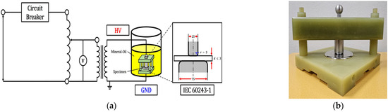The insulation strength and short-term breakdown time of epoxy/Al2O3 micro-composites were obtained according to IEC 60243-1 [29]. The overall test setup is shown in Figure 4. To evaluate the AC insulation characteristics, the setup consisted of a high-voltage source and test electrodes. As shown in Figure 4, the electrode arrangement with embedding must be made for films and boards of up to 3 mm [29]. For the short-term breakdown test, both the ramp test (RT) and step-up test (ST) were considered.