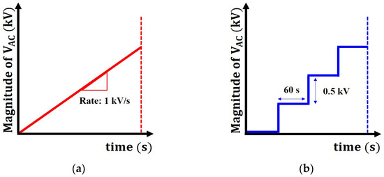 Voltage application method by test procedure: (a) ramp Test; (b) 60 s step-up test.