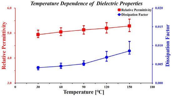 The average values of the relative permittivity and dissipation factor are summarized in Table 1. Additionally, the graphs of the relative permittivity and dissipation factor at each temperature are presented in Figure 6. The results of the relative permittivity and dissipation factor measurements exhibited temperature-dependent characteristics. As the temperature increased from 30 °C to 150 °C, both the relative permittivity and dissipation factor showed increases. The relative permittivity showed a limited increase (less than 5%) when the temperature increased from 30 °C to 60 °C and 90 °C. However, the values measured at 120 °C and 150 °C showed increases of approximately 5% and 6.8%, respectively, compared to value measured at 30 °C. Regarding the dissipation factor, measurements at different temperatures were found as follows. Compared to the dissipation factor value of 0.0041 measured at 30 °C, the value measured at 60 °C and 90 °C showed increases of approximately 9.8% and 24.4%, respectively. The values measured at 120 °C and 150 °C showed a noticeable increase compared to the value measured at 30 °C (approximately 68.3% and 109.8%, respectively).