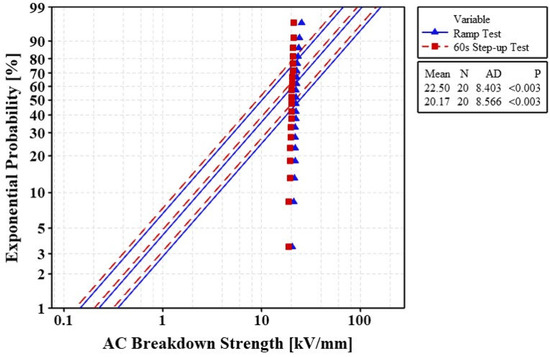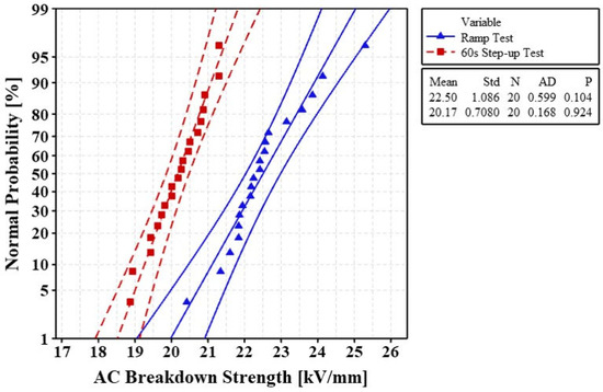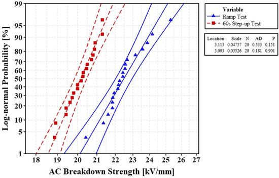 This section presents the results of the RT-BDS and ST-BDS measurements and determine whether the breakdown data set complies with the normal and Weibull distributions [18,19]. These probability distributions are known as the most commonly used models for analyzing the BDS of dielectrics. They serve as useful models in designing and maintaining power equipment by improving the predictability of insulation performance [35].