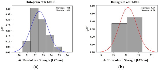 Figure 7 presents the normal distribution graph of the AC-BDS values of epoxy/Al2O3 micro-composites for the two voltage application methods. Additionally, Table 2 and Table 3 summarize the results of the normality test performed on the AC-BDS values for each experimental method. While Table 2 shows the result for the RT experiment, Table 3 shows the result for the ST experiment. In each table, the statistics from Shapiro-Wilk [19], Anderson–Darling [20], Ryan–Joiner [21], and Kolmogorov–Smirnov [22] tests are shown along with the p-values for each method. In addition, compliance with the normal distribution is also indicated. At all test statistic levels (Shapiro–Wilk: W, Anderson–Darling: A-D, Ryan–Joiner: R-J, Kolmogorov–Smirnov: K-S), the p-values were all higher than the significance level of 0.05, indicating that the experimental data follow the normal distribution law. Figure 8 shows the histogram of the average distribution of the BDS obtained from both breakdown tests (i.e., RT and ST), and the corresponding skewness and kurtosis values are provided in Table 4. According to A. Beroual et al. [33], this representation allows for the detection of potential anomalies in the distribution of the BDV across various voltage ranges. In this context, potential anomalies refer to outliers (or abnormal patterns) that may occur in the distribution of RT-BDS or ST-BDS. However, when considering the skewness and kurtosis values, it was observed that the epoxy/Al2O3 micro-composites slightly deviates from a perfect normal distribution, where skewness and kurtosis should be 0 and 3, respectively. The experimental results show that the skewness values for RT-BDS and ST-BDS are close to 0, with values of 0.75 and −0.19, respectively. On the other hand, the skewness values deviate somewhat from the normal distribution, with RT-BDS at +0.80 and ST-BDS at −0.79. Additionally, since the peak kurtosis value is less than 1.4, this distribution can be considered slightly platykurtic, as noted in [33,46]. There are various software options available for obtaining skewness and kurtosis. For practical reasons, most statistical software packages, such as R [31] or SPSS (Statistical Package for the Social Sciences) [47], are commonly used. In this study, skewness and kurtosis were calculated using the Python 3.9 software package [48] and its statistical libraries.