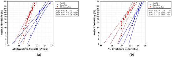 Weibull distribution of the breakdown data: (a) AC-BDS; (b) AC-BDV.