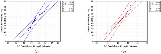 In this study, the Anderson–Darling method, which was introduced in Section 3.1.2, was used to study the effectives of different statistical distribution models for modeling the AC breakdown performance. The selection of the statistical distribution for analyzing the AC-BDS of the epoxy/Al2O3 micro-composites was based on References [23,24]. According to [23], distributions such as Weibull, Gumbel, and log-normal are used in the statistical analysis of failure data for insulating materials. Furthermore, [24] stated that log-normal, exponential, and gamma distributions are used in high-voltage engineering. Accordingly, this paper analyzes the AC-BDS of the epoxy/Al2O3 micro-composites using normal, Weibull, log-normal, exponential, and gamma distributions. At this stage, the best suitable distribution was selected by comparing the Anderson–Darling test statistic (A-D value) with the p-value. Meanwhile, the characteristics of the normal distribution and log-normal distribution are similar. Hence, please note that the normal distribution was excluded from the goodness-of-fit test. The statistical distributions used for the goodness-of-fit test are briefly introduced as follows.