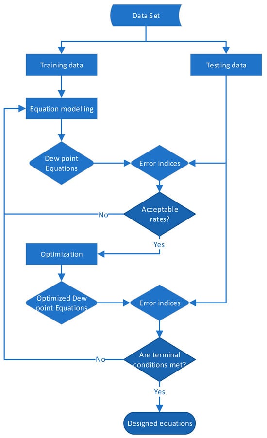 Following the development of these equations, their efficacy is assessed through established statistical measures, quantifying the correspondence between forecasted and observed DPT. This systematic approach’s workflow is shown in Figure 1. The observed data constitutes a dataset utilized for dual purposes: as training and testing data. The training dataset serves as the foundation for deriving equations that model the data distribution. Should the obtained equations yield satisfactory results (R2 > 0.95, STD < 2), the process proceeds to optimization; otherwise, it reverts to mathematical modeling. Subsequent to the optimization phase, where the coefficients are tuned, the results undergo statistical scrutiny to ascertain any enhancements compared to prior iterations. Specifically, an approximation target of R2 ≥ 0.99 and STD < 1 is sought. Subsequently, an iterative simplification procedure ensues, wherein the decimal precision of equation components is successively reduced. Acceptance of modifications is contingent upon the demonstration of improved results after each iteration; otherwise, iterations are performed on a term-by-term basis of the equation. Should any variation yield superior outcomes, the process concludes.