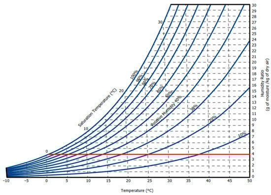 Defining the background to consider, it is also necessary to include the relevant boundary conditions. Understanding the relationship between temperature and relative humidity in atmospheric conditions is crucial for explaining water condensation. The psychrometric chart is a key tool in this regard, providing important insights. Specifically, the horizontal line at 0 °C on the chart, shown in Figure 2, marks the acceptable range where temperature and relative humidity intersect within feasible limits.
