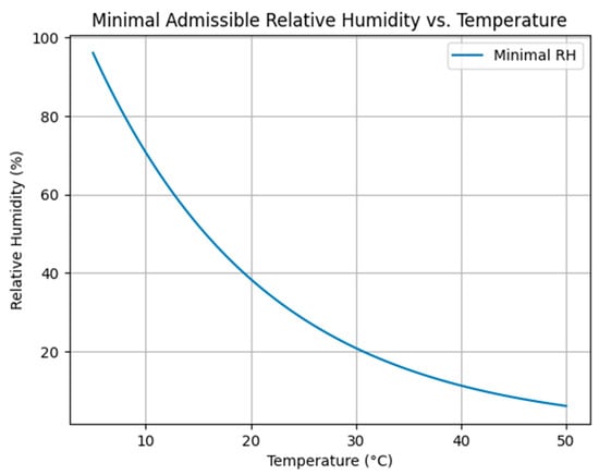 This equation encapsulates the empirical relationship between temperature and relative humidity along the 0 °C line, defining that RH should not be less than . By plotting this equation, it is possible to visually represent the range of temperature and relative humidity values where condensation of water vapor occurs under atmospheric conditions, as shown in Figure 3.