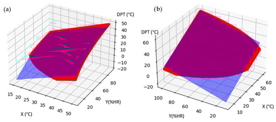 Reaching the DPT is unfeasible under conditions falling below the delineated threshold, as depicted by the red line in Figure 2. Additionally, the practical limitations of commercial cooling systems render temperatures below approximately 5–7 °C [,] unattainable, further constraining the applicability of predictive models in real-world scenarios. To address this, adjustments were made to the Magnus–Tetens’ equation to preclude erroneous values below 0 °C. Furthermore, empirical data revealed that relative humidity rates of 20% become feasible only upon attaining temperatures exceeding 25 °C. Consequently, the observed dataset was restricted to relative humidity rates surpassing this threshold to optimize the utility of available data points. Notably, this study scrutinized approximately 9000 data points encompassing temperatures ranging from 5 to 50 °C and relative humidity spanning from 20 to 100%, with each parameter measured at 300 intervals between the minimum and maximum values. To calibrate and validate predictive models like the second-order polynomial, a large dataset is crucial. While, theoretically, only a few points are required to fit a polynomial, these would not suffice to ensure the model’s robustness, accuracy, and reliability across a wide range of conditions. The extensive dataset of 9000 points allows for capturing the inherent variability in the observed phenomena, thereby refining the model to generalize well to unseen data. This comprehensive approach ensures that the model not only fits the given data accurately, but also performs reliably under various conditions, preventing overfitting and improving predictive capabilities. In essence, the large dataset serves to enhance the model’s validity and utility, making the predictions more trustworthy and applicable in real-world scenarios.