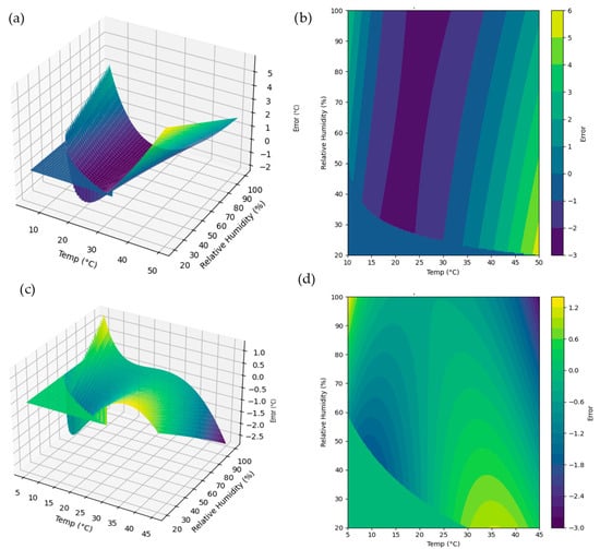 Figure 5 illustrates the error rates of each equation relative to the observed values, providing both 2D and 3D perspectives. The 3D plots represent a surface, encompassing regions beyond the specified boundaries, creating a waterfall-like visualization near the limits. Dark blue shades denote lower error values, indicative of temperatures below 0 °C, while yellow hues signify higher errors, associated with temperatures above 0 °C. Conversely, the 2D representations employ a contour plot method to present a heatmap of error distribution across temperature and relative humidity ranges.