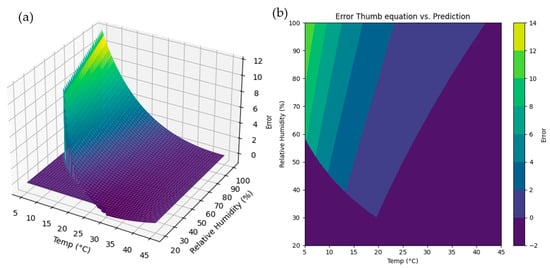 Figure 6 shows the graphical representations of the error rate obtained using the Thumb equation as a representative example of a commonly used equation for estimating DPT from ambient temperature and relative humidity. The results highlight substantial errors. Specifically, the 3D surface plot from Figure 6a displays a significant underestimation of dew point at lower temperatures, increasing together with the relative humidity. Conversely, at higher temperatures, it produces homogeneous accurate results independently from the relative humidity. In the case of the 2D heatmap in Figure 6b, it provides a detailed visualization of these discrepancies across the temperature and humidity spectrum. The error magnitude increases markedly with temperature, peaking particularly in the higher temperature ranges, where errors escalate to over 12 units. This gradient shift from cool to warm hues in the heatmap clearly illustrates how the error magnitude is exacerbated by increasing temperatures, regardless of humidity levels.