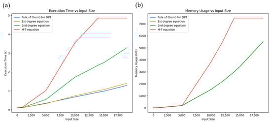 Computational cost results allowing RAM usage. (a) Execution time versus input size. (b) Memory usage versus input size.
