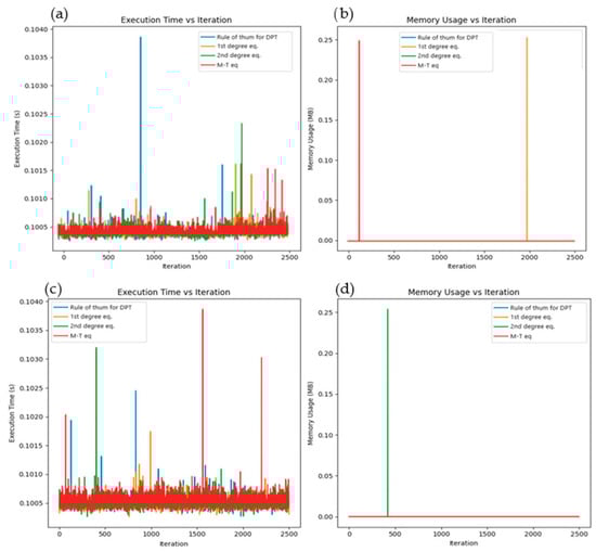 Additionally, equations were tested with the same methodology, replacing the use of RAM for writing intermediate results to a file, as represented in Figure 8. Firstly, data and results are stored one by one (Figure 8a,b), and secondly, in blocks of 1,000 entries (Figure 8c,d). The execution time and memory usage for each equation were measured and recorded, ensuring efficient memory management. Figure 8 illustrates the execution time, in the first case, Figure 8a, and in the second case, Figure 8c. Additionally, the memory usage across iterations is shown for the first case in Figure 8b and for the second case in Figure 8d, highlighting the performance differences between the equations. Figure 8a,c displays the averaging of each 100 results to enhance clarity and avoid noise.