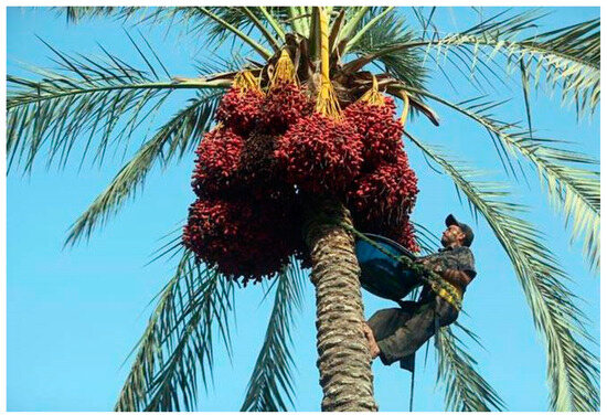 Date palm trees (Phoenix dactylifera) are tall trees that grow to heights of up to 24 m [1]. They are characterized by cylindrical stipes (trunks) over which a crown of leaves develops. Among the leaves are the branches that carry the sought-after date fruits. Date palm is cultivated in over 30 different countries with production totaling approximately 9.7 million tons [2,3].