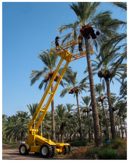 Various mechanical systems employing hydraulic lifts and additional apparatus such as forklift towers and cranes have been employed to access dates on lofty trees [13,14], Figure 2. There have been endeavors to adapt industrial machinery for date palm harvesting, particularly in the Kingdom of Saudi Arabia [9,15,16,17]. However, these machines come with substantial costs and require a substantial workforce to operate. Furthermore, their ability to reach exceedingly tall trees is limited, imposing constraints on their utility. Moreover, workers may be unavailable in certain situations, such as during the COVID-19 crisis, which greatly reduced the date harvesting process and caused significant losses.