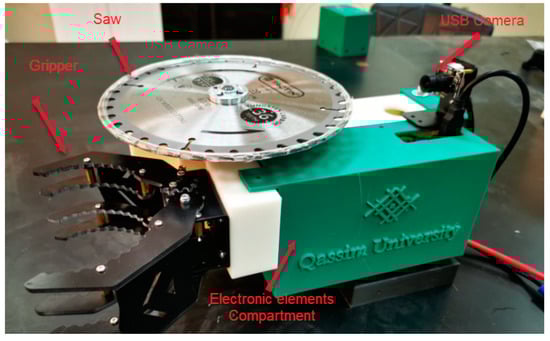 The robotic arm takes on the crucial task of grasping and severing the palm branch, comprising three essential components: a saw, a linear actuator, and an end effector, as shown in Figure 5. These components are seamlessly integrated within a purpose-built housing, meticulously designed to ensure the system’s flawless and efficient operation.