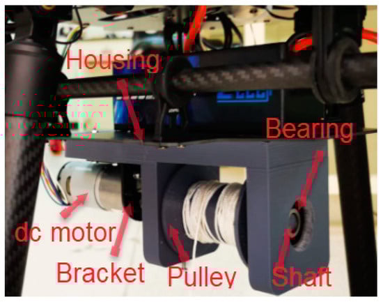 The winch, situated at the base of the quadrotor, assumes the pivotal role of raising and lowering the robotic arm. Comprising essential components, the winch assembly includes a DC motor, a motor bracket, a flexible coupling, a pulley, a shaft, and two bearings, as shown in Figure 6. To house and support these elements, a specially designed housing structure is employed.