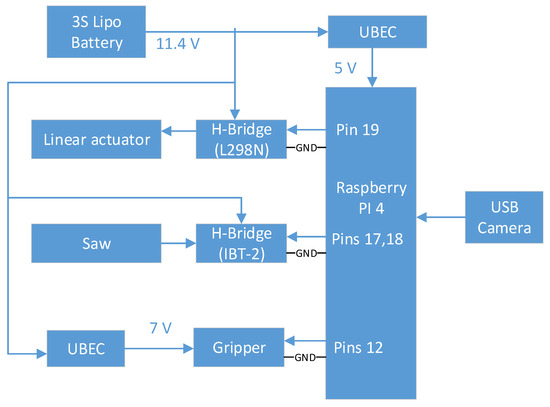 The control of the system can be done through two Raspberry PI companion computers through the Android application. The first RPI is fixed on the arm and it is used to control the saw, the linear actuator, and the end effector, Figure 8. The second RPI is fixed on the quadrotor and it can control the winch and capture the video stream of the depth camera, Figure 9. Each RPI can capture the video streams of two cameras, depth, and USB.