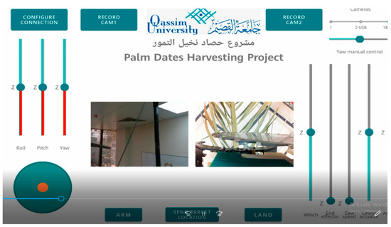A screenshot of the application’s main screen is shown in Figure 10. Within the application, users can manipulate the winch and the robotic arm components (saw, linear actuator, and end effector) through intuitive sliders. Furthermore, the application receives and records video streams from two cameras, with one of them potentially serving as a depth camera. The quadcopter itself can be controlled via a remote controller (RC), granting users full command over its flight. This comprehensive software system significantly enhances the versatility and usability of the MRFV for date palm harvesting.