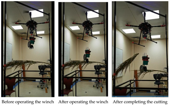 Ultimately, a decision was made to approach the branch from above and suspend the cutting tool (the saw) using a lengthy wire, hanging from an MRFV. The recommended system comprises a quadrotor flying vehicle with a winch mounted beneath it to support a suspended manipulator arm equipped with a saw mechanism, Figure 4. The quadrotor is equipped with an autopilot and a Raspberry Pi (RPI) companion computer linked to a depth camera. A mobile application has been developed for remote control of both the quadrotor’s movements and the operation of the saw-equipped arm. Additionally, this application facilitates the viewing of live video feeds from cameras fixed on both the quadrotor’s body and the robotic arm. The quadrotor transports the robotic arm to the date palm branch, and the saw mechanism is employed to execute the cut, with the branch securely held by an end effector attached to the arm.