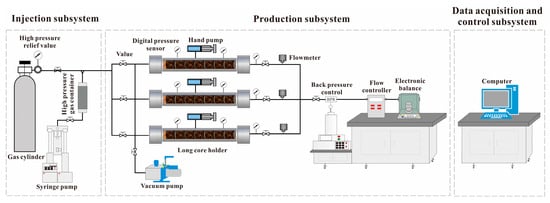 The experimental setup consisted of three subsystems, i.e., the injection subsystem, production subsystem, and data acquisition and control subsystem. In the injection subsystem, a high-pressure gas cylinder (WMA219-40-15, 40 L) was utilized to supply gas to the transfer cylinder. A high-pressure syringe pump (100 DX, ISCO Inc., Lincoln, NE, USA) was employed for injecting gas from the transfer cylinder into the core plugs contained in the coreholders (DCD-80b, Hai’an County Petroleum Scientific Research Instruments Co., Ltd., Nantong, China) in the production subsystem at various pressures. These long coreholders, within which the cylindrical cores at each layer were horizontally assembled, were capable of accommodating a core plug with a length of up to 80 cm. To provide confining pressure for the core plugs, a high-pressure manual pump (JB-II, Hai’an, China) was used with an additional 2.00 MPa above the injection pressure setting. Initially, a vacuum pump (FY-4c-N, Nantong, China) was employed to evacuate the cores and remove the impurities. Each long coreholder was equipped with three digital pressure gauges (3051TG, Rosemount, Chanhassen, MN, USA) at its inlet, middle, and outlet, each of which had a pressure range of 0–69 MPa and an accuracy of 0.025% full-scale. Also, a flow controller was employed to regulate the total gas flow rate during the depletion of one or multiple long core plugs. A back pressure regulator (BPR) (HY-2, Nantong, China) primarily controlled the ultimate outlet pressure, while several mass flowmeters (DMF-1-1, Beijing Shouke Shihua Automation Equipment Co., Ltd., Beijing, China) with a pressure range of 0–40 MPa and an accuracy of ±(0.8% reading + 0.2% full-scale) were utilized for real-time monitoring and measuring the flow rates of each individual layer. The data acquisition and control subsystem enabled most data collection and experimental operations to be continuously monitored and measured via a desktop computer, thereby minimizing experimental errors associated with manual operations.