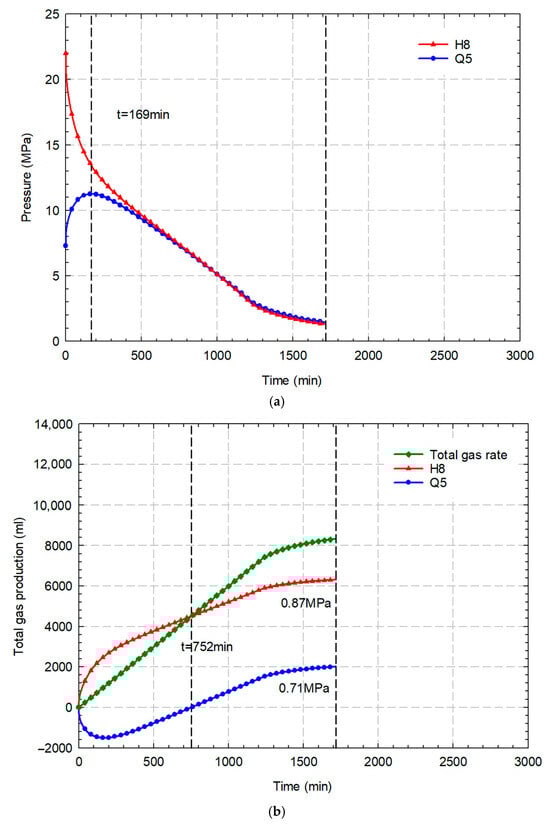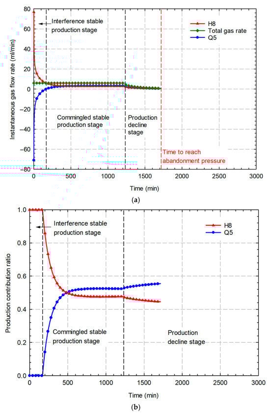 Although the total gas production remained constant during the period from the very beginning to 1234 min, the productions from each individual layer Q5 or H8 underwent a complex stage with an initial interlayer interference followed by joint gas production. Due to the pressure difference between interlayers, gas was not discharged from the low-pressure layer during the initial stages of production. Moreover, gas from the high-pressure layer not only flowed out of its outlet, but also flowed back into the low-pressure layer. By analyzing the curves of instantaneous gas production and gas contribution rate over time for the commingled Q5 + H8 layer production, it is evident that, within the initial 169 min of extraction, not only did the high-pressure layer H8 exclusively contribute to gas production at its outlet, but there was also a reverse flow of gases from layer H8 into the low-pressure layer Q5, resulting in a negative actual gas contribution from the latter. After 169 min, the instantaneous gas production rate and gas contribution ratio of the layer H8 exhibited a gradual decline, while the gas production rate of the layer Q5 was transitioned from negative to positive, initiating gas generation and its subsequent stabilization (see Figure 2a,b).