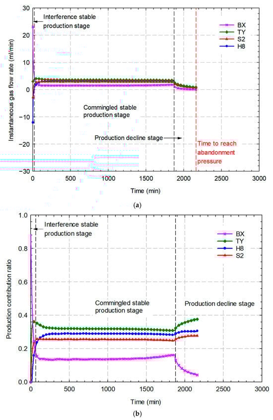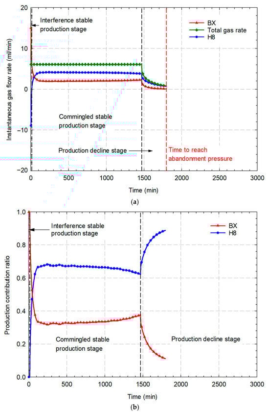 (a) Instantaneous gas flow rate and (b) production contribution ratio curves for the commingled production of H8 + BX layers.
