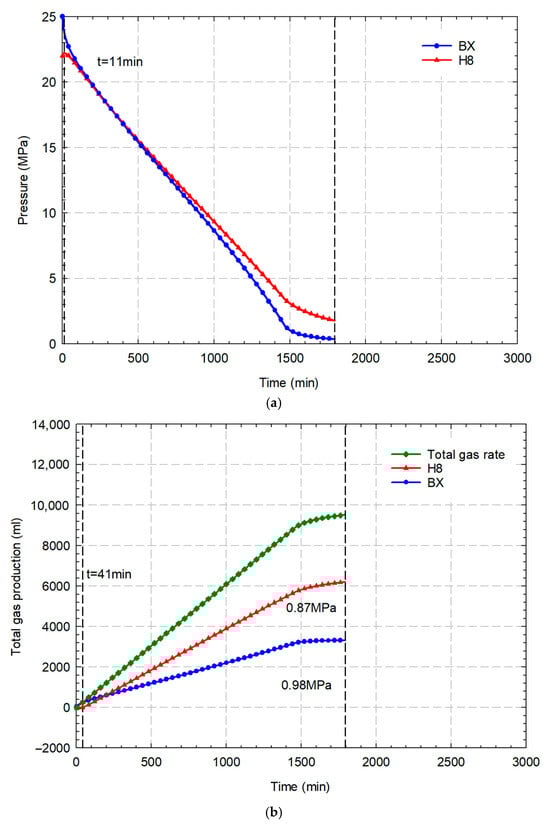 (a) Pressure change and (b) accumulated gas production curves for the commingled production of H8 + BX layers.