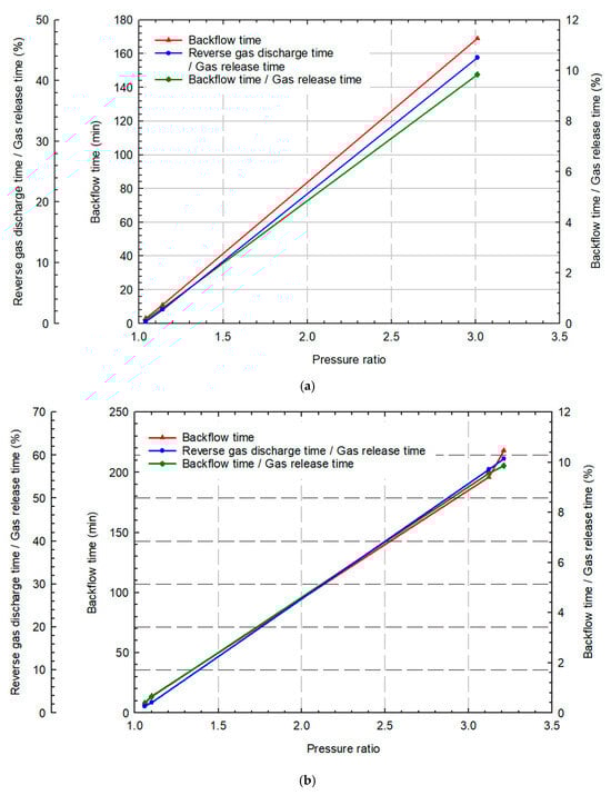 Backflow time, backflow time/gas production time, and backflow gas discharge time/gas production time curves under different interlayer pressure differences in the (a) commingled two-layer production and (b) commingled three-layer production.