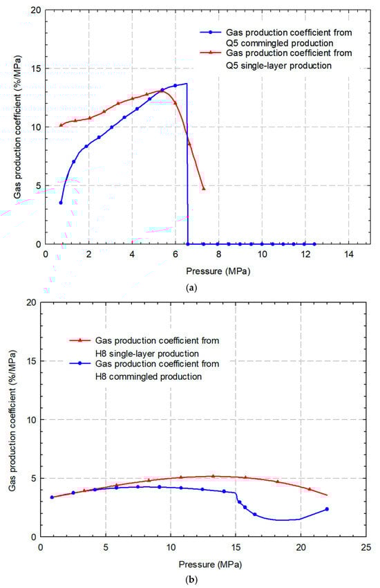 Gas production coefficients of (a) layer Q5 and (b) layer H8 in commingled two-layer (Q5 + H8 layer) production experiments, together with their corresponding single-layer depletion experiments.