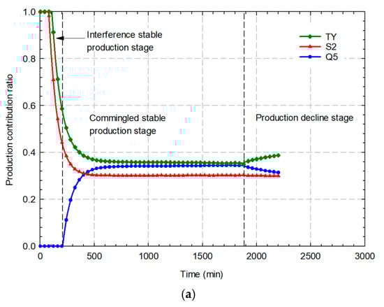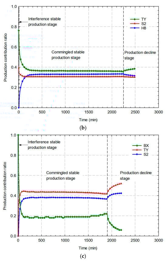 Production contribution ratio curves for the commingled production: (a) Q5 + S2 + TY layers; (b) H8 + S2 + TY layers; and (c) S2 + TY + BX layers.
