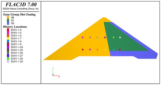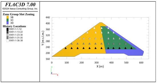 In Figure 3 the FLAC numerical model for SBY CFRD is shown with the zoning and the control points selected for comparison with the experimental data. The discretization comprises 15,791 zones and has been restrained by fixing the vertical and horizontal velocities at the base of the dam. The construction phases and the impounding phases have been simulated following the data available in the literature [35,36,37,38].