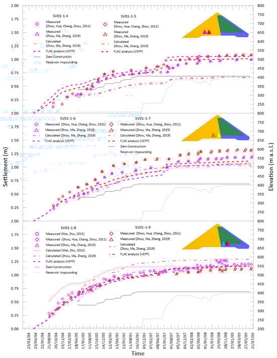 The results predicted with the VEPP model were compared with the observed settlement histories at different locations in the dam body. The locations selected correspond to an elevation of 235 m (points SV01-1-4 to SV01-1-9), shown in Figure 4, and to an elevation of 300 m (points SV01-1-24 to SV01-1-29), as shown in Figure 5.