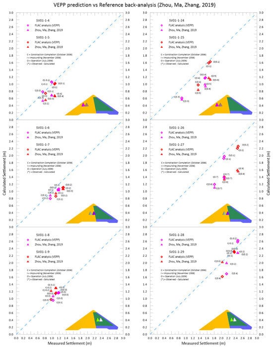 Up to now, the results of the VEPP model have been compared with the only one predictive model available in literature [17]. Other models available for the Shuibuya dam do not address deformation prediction but rather back-analysis [35,43]. When results of deformation predictions of other very high CFRD dams using other models become available in the next years, it will be possible to make further comparisons with VEPP.