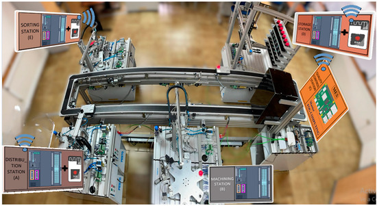 The MPS has different modular in-line production stations (distribution (A), machining (B), quality control (C), storage (D) and sorting (E)), which communicate through the ASI communication protocol arranged along the entire pallet conveyor belt route. Each station is controlled by a PLC S7 300 programmable logic controller, manufactured by Siemens AG in Munich, Germany, except the quality control station, which is strategically controlled by an embedded card. With these features offered by the MPS, the synchronization of the production plant is defined according to business requirements, as is the restructuring of the original production process for the incorporation of new technologies (see