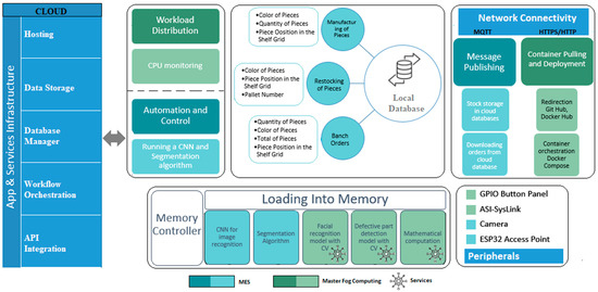 Functional layer: The functional layer is embodied in the management performed by the MES and the MFC by coordinating the stations within the production operations and distributing the tasks to the FCS nodes, thus automating the replenishment of the warehouse according to the orders. In addition, the FCS nodes run computer vision algorithms for quality control and facial recognition, showing how the functional layer integrates advanced and distributed tasks, optimizing the production flow.