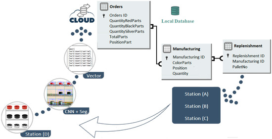 The token replenishment process at station (D) is performed in such a way that each warehouse rack is matched with a characteristic color of the piece. On the other hand, each time the dispatch process is completed, an image of the current situation of the warehouse is automatically captured by means of a 720p HD webcam for the execution of an object detection model in real time using YOLO v5 convolutional neural networks (CNNs), and then a segmentation algorithm is applied to precisely delimit the space corresponding to each detected piece and thus know its position within a matrix that is generated in the image (see