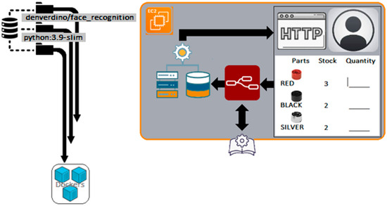 Within the process of scaling up the MPS to Industry 4.0, web content for remote users to the plant was also provided, allowing them to request their orders according to the stock available on the production floor; this means that efficient data flow and proper management of traffic through necessary ports must be ensured. For that reason, an infrastructure of cloud services was assembled, starting from an AWS computing resource, specifically the Elastic Compute Cloud (EC2), to which several services were added such as an MQTT broker (Mosquitto) that acts as a ‘topic1’-specific channel communication intermediary with the MES over port 1883, allowing AI (warehouse stock) results to be processed and organized via Node-RED over port 1880 to the MySQL database. At this point, and through port 80, a user can send an HTTP request to the Apache server, and it provides the phpMyAdmin web page, allowing the user to query the database, for example, to view the stock of parts available at station (D). At the moment, when the user requests a production order, the database is updated, and Node-RED is waiting to extract the information in vector form when the MES requests that specific dispatch channel, as seen in