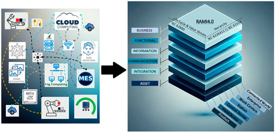 The hierarchical layers of RAMI 4.0 (Assets, Integration, Communication, Information, Functional and Business) are shown in this project, highlighting the transformation of a conventional production plant into a smart and connected environment: