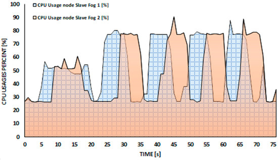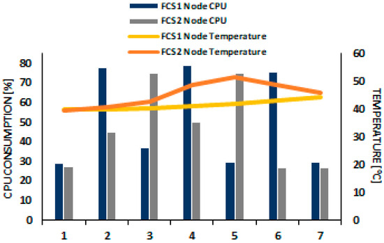 Figure 7 shows that there are fluctuations that indicate the execution of one or several processes in each FCS node, and there is also an approximate consumption of 28% in the idle state in certain periods due to the fact that they are in alert mode when attending the MFC requests. At the beginning, both nodes start with moderate CPU usage, ranging between 50% and 60%, corresponding to the independent execution of the computer vision algorithms, in which case no intensive use of resources is required. As time progresses between 20 and 40 s, a saturation close to 75% and 80% is observed, indicating the execution of the facial landmark and part quality control processes. In addition, the load distribution between both nodes is understood through an orchestration scheme coordinated by the MFC. Continuing on the timeline, just before the 40 s second mark, the onset of high CPU usage cycles by the FCS2 node over 90% is visualized, suggesting that the orchestration system identified processor consumption percentages on the FCS1 node over 60% at the time the mathematical calculation process was requested, there was efficient action by the MFC node to avoid oversaturation on the node and, consequently, a stable temperature regime of operation in the control units of the FCS nodes was achieved, as shown in