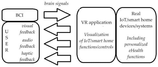 Integrating BCI with VR can significantly increase the efficiency of BCI in controlling IoT systems such as smart homes. This is particularly important in aging societies in developed and developing countries, where automation of daily living activities, healthcare, and management within a smart home may be the only solution to meet the needs of people with cognitive disabilities who are limited by age. By a smart home, we also mean technologies for use in, for example, nursing homes, senior condominiums, or even in resorts and sanatoriums. VR can provide immersive training environments, allowing users to practice controlling devices using brain signals, which improves the accuracy and speed of BCI commands. The real-time visual feedback provided by VR can help users understand how brain signals interact with a system, leading to more intuitive and efficient control. VR environments can simulate different smart home scenarios, allowing users to control different devices in a low-risk virtual space before interacting with the devices in the real world. In addition, integrating VR with BCI can help overcome the limited interface and feedback challenges of traditional BCIs by visually presenting complex data in an accessible way. This increases user engagement and learning because VR can adapt to the user’s skill level, gradually increasing task complexity, which improves neural adaptation over time. For users with disabilities or impaired mobility, VR offers a non-contact, immersive interface that allows them to control their smart homes more independently. Additionally, machine learning algorithms used in VR simulations can analyze brain patterns and optimize system responsiveness based on individual user preferences. As BCI technology improves with VR training, it has the potential to provide smoother, more accurate control of IoT devices by reducing misinterpretations of brain signals. Combining VR and BCI can also enable remote or multi-device control, where users seamlessly manage multiple IoT devices in a single virtual environment, thus increasing convenience and efficiency in smart homes.