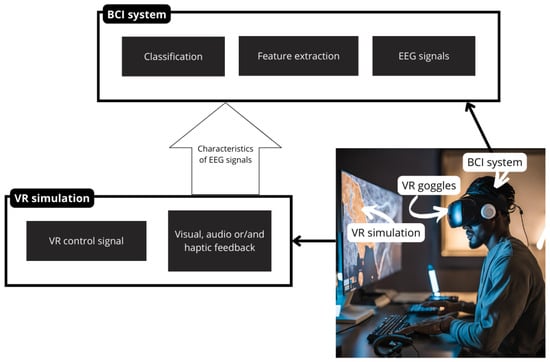 The integration of virtual reality and brain–computer interfaces has been explored in various research studies. Brain–computer interfaces have the potential to serve as a powerful control mechanism for a variety of applications by allowing direct communication between the human brain and external devices. When integrated with virtual reality environments, BCIs can enable users to influence navigation, communication, and other assistive functions through intuitive, multisensory interactions that engage the user and enhance their motivation and engagement. The immersive and interactive nature of virtual reality can amplify the capabilities of BCIs, providing a rich, context-specific interface for users to control digital systems and environments using their neural activity.