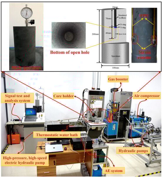 As shown in Figure 2, the shale specimens used for fracturing had a diameter of 100 mm and height of 200 mm, with a central borehole of 10 mm in diameter and 110 mm in height, leaving an open hole section with a depth of 40 mm. The shale bedding planes were oriented perpendicularly, with the borehole drilled parallel to the bedding planes. The packer fixing method for sealing and forming the open hole was described in detail by Zhu et al. [] and Zhang et al. [].