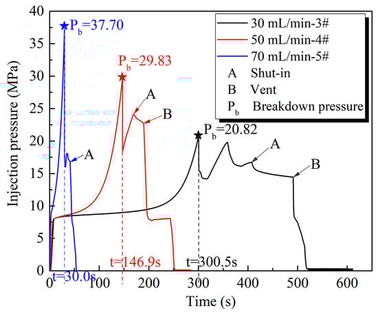 A comparison of breakdown pressures under different flow rates has revealed that higher flow rates resulted in higher breakdown pressures. As shown in Figure 4, the breakdown pressures at flow rates of 70 mL/min, 50 mL/min, and 30 mL/min were 37.70 MPa, 29.83 MPa, and 20.82 MPa, respectively. Correspondingly, the times to reach breakdown pressure were 30.0 s, 146.9 s, and 300.5 s, indicating that higher flow rates can raise CO2 injection pressure, causing shale failure more quickly.