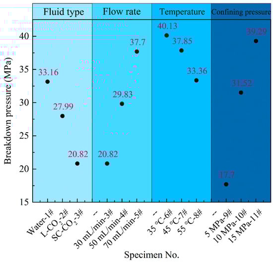 The fracturing process is typically analyzed by monitoring the variation in injection pressure over time. The peak of the injection pressure curve, which corresponds to the first maximum fluid pressure, is identified as the breakdown pressure (denoted as  hereafter). Reaching this pressure signifies that the shale specimen is fractured [,]. To illustrate the injection pressure curve, the results from the flow rate have been provided as an example in Figure 4. In addition, since the primary focus of this study is breakdown pressure, the breakdown pressure values for each scenario are listed in Figure 5.