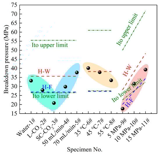 Various fracturing parameters such as the type of fracturing fluid, flow rate, temperature, and confining pressure significantly influence the experimental breakdown pressure values. For instance, an increase in the flow rate corresponds to a rise in breakdown pressure, as it relates to the rate of pressurization. Although the Ito model accounts for both pressurization rate and wellbore diameter, the upper and lower bounds of this model do not encompass the breakdown pressure for specimens 3 and 9 (Figure 6). This limitation may be attributed to the inherent heterogeneity of natural rock.