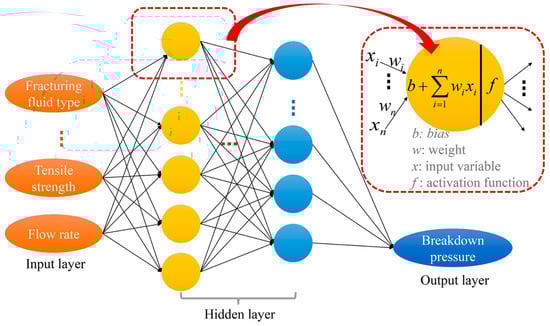 Similarly, the factors affecting fracturing effectiveness are numerous and interconnected in complex, nonlinear ways []. If breakdown pressure, a key indicator for fracturing effectiveness, could be predicted prior to experimentation or field operations, it would provide valuable reference data for optimizing fracturing design parameters. Presently, large-scale field fracturing experiments are costly and cannot be conducted repeatedly. Consequently, the trend leans towards small-scale laboratory experiments, which also require complex testing procedures and rock preparation []. Therefore, we aim to predict breakdown pressure under the influence of multiple factors by identifying the primary factors influencing breakdown pressure, collecting a substantial dataset from fracturing experiments, and employing neural networks to model the intricate nonlinear relationships between input and output variables.