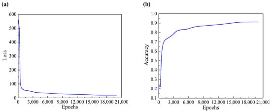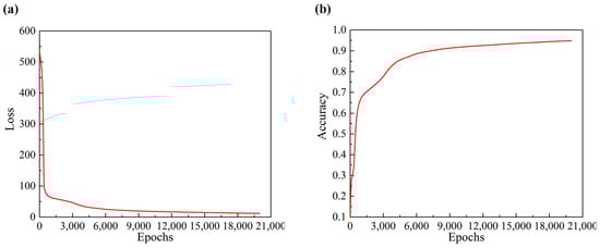 The maximum number of epochs for model training was set at 20,000, utilizing stochastic gradient descent as the optimizer with a learning rate of 0.0001. After conducting multiple tests with varying sample sizes and comparing the expected results, we selected a model consisting of three fully connected hidden layers, with 16, 16, and 12 neurons, respectively. The loss and accuracy results for the training and testing sets are shown in Figure 8 and Figure 9. As illustrated, the loss function was initially high, but upon increasing the number of iterations, the error between the actual and predicted values decreased for both the training and testing sets, eventually stabilizing. After stabilization, both training and testing accuracy exceeded 90%, indicating that the multi-layer neural network model effectively learned and predicted breakdown pressure.