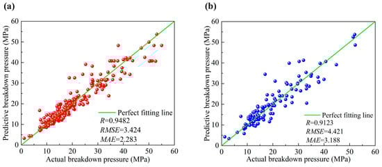 To further validate the prediction performance of the trained model, we compared the predicted values from the training set with the actual values and performed a regression analysis of the predicted versus actual values for the testing set. The coefficients , , and  were calculated, as shown in Table 3. Figure 10 illustrates that the data points for both the training and testing samples are closely aligned with the ideal fit line, where the actual value equals the predicted value. The , , and  values for the training set (testing set) were 0.9482 (0.9123), 3.424 (4.421), and 2.283 (3.188), respectively.