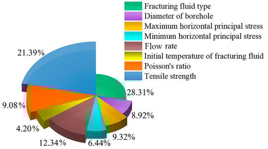 As illustrated in Figure 12, the relative importance of the factors is ranked as follows: fracturing fluid type > tensile strength > flow rate > maximum horizontal stress > Poisson’s ratio > wellbore diameter > minimum horizontal stress > initial fracturing fluid temperature. Specifically, fracturing fluid type and tensile strength are the most sensitive variables, contributing 28.31% and 21.39% of the influence, respectively. This is due to the significant role of fracturing fluid properties in establishing the pore pressure system within the rock, and the critical impact of effective stress on fracture initiation. Tensile strength directly determines the rock’s failure resistance, as it defines the relationship between effective circumferential stress at the wellbore or characteristic distance and the rock’s ability to resist failure [].