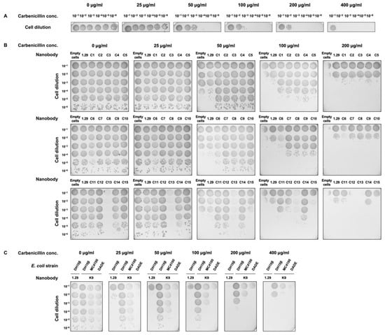 E. coli strain NEB10β (New England Biolabs, Ipswich, MA, USA) was used for plasmid and library construction as well as Nb selection experiments. Spot plating for identification of library selection conditions and selective plating for FLI-TRAP selection were performed using NEB10β, as described by Waraho and DeLisa [,]. Wild-type E. coli strain MC4100 [] and DADE [], the isogenic ΔtatABCDΔtatE derivative of MC4100, were used in a spot plating assay to confirm the Tat transport. Bacterial cells co-transformed with pDD322-Kan TatABC and pDD18-Cm RBD-Bla::ssTorA-1.29 Nb-FLAG or pDD18-Cm RBD-Bla::ssTorA-C11 Nb-FLAG were used for identification of library selection conditions by spot plating, while pDD18-Cm RBD-Bla::ssTorA-Nb library-FLAG was used for library selection by spreading cells on selective plates. The introduction of the pDD322-Kan TatABC vector was supposed to increase the number of Tat channels present on the cell membrane, thereby enhancing the export of the protein complex []. Cells were grown overnight at 37 °C in LB medium supplemented with 25 µg/mL chloramphenicol (Cm) and 50 µg/mL Kanamycin (Kan). The next day, overnight cells of each sample were normalized in fresh LB to OD600 = 2.5. For spot plating, 5 µL of serially diluted cells were spotted onto LB agar plates supplemented with 1.0% arabinose and varying amounts of Carb (0–200 µg/mL). For Nb library selection, 100 µL of dilution 10-fold higher than the condition identified for library selection [] was spread onto LB agar plates supplemented with 1.0% arabinose and varying amounts of Carb (50–200 µg/mL), as indicated. Plated bacteria were incubated at 25 °C for 48 h. For Nb purification, pET-28a Nb-FLAG-His plasmids were transformed into E. coli strain BL21(DE3) (Novagen, Madison, WI, USA). Overnight cultures were subcultured in 1 L of LB medium supplemented with 50 µg/mL Kan, and protein expression was induced when OD600 reached 0.6–0.7 with isopropyl β-D-1-thiogalactopyranoside (1 mM) at 25 °C with 200 RPM agitation for 16 h. The details of strains and plasmids used in this study are included in Table S2.